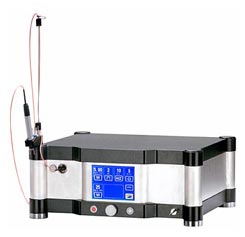 Sollen tieferliegende Gefäße erfasst werden, kommt zusätzlich der Diodenlaser zum Einsatz. Dieser erreicht auch insbesondere blaue und violette Gefäße z.B. bei der Behandlung von Besenreiservarizen und Krampfadern. Gerade diese Behandlungsindikation war mit bisherigen Lasersystemen nicht optimal zu beherrschen. |